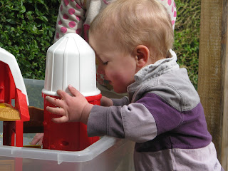 All of a sudden, playthings seem to interest him more - he enjoyed pouring rice into the grain silo on the farm and then letting it out again - as well transporting the rice all over the place, including into the water tray......
